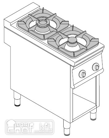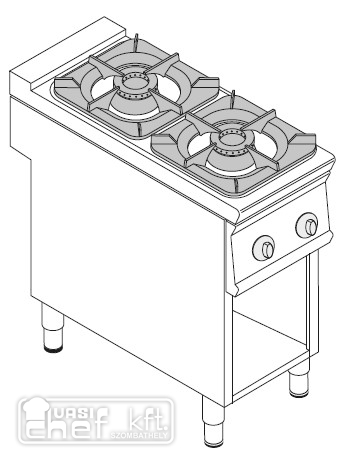 Teljesen rozsdamentes acél kivitel. Állítható lábak. Öntöttvas edénytartó rácsok. Alul nyitott tárolóval, alsó polccal.