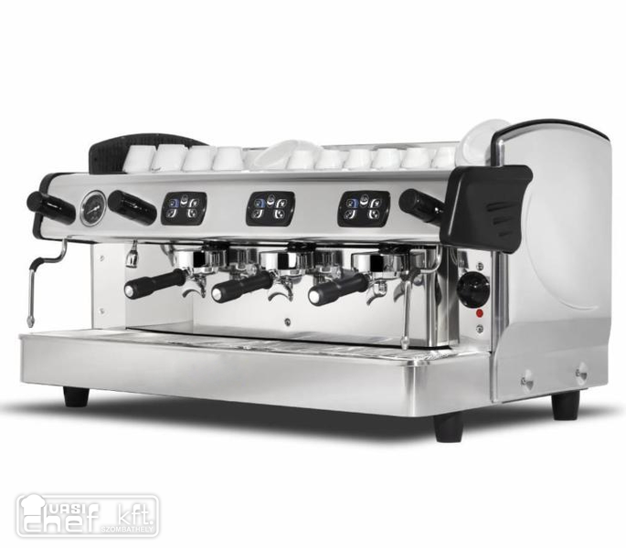 Az automata kávéfőzőgép 3 adagolófejjel, adagolókapcsolókkal, automata vízfeltöltővel, 17,5 literes réz kazánnal, hőcserélővel, tisztító szeleppel, rozsdamentes acél adagolóval és melegvíz csappal rendelkezik.