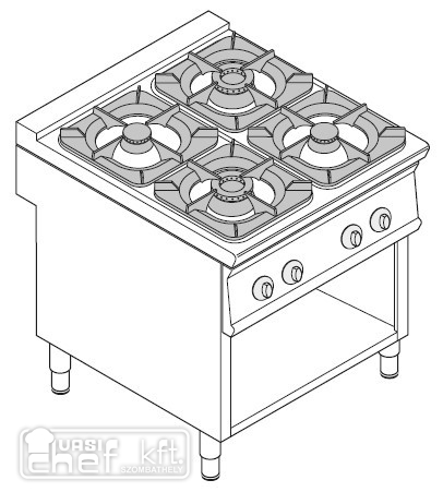 Teljesen rozsdamentes acél kivitel. Állítható lábak. Öntöttvas edénytartó rácsok. Alul nyitott tárolóval, alsó polccal.