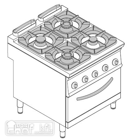 Teljesen rozsdamentes acél kivitel. Állítható lábak. Öntöttvas edénytartó rácsok. Alul GN 2/1 gázüzemű statikus sütő.