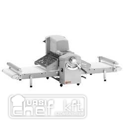 Asztali tésztanyújtó gép, 500x750 mm méretű nyújtási felülettel, szabályozható nyújtási vastagsággal: 0-38 mm között, 1 sebességgel (50 cm / másodperc), manuális vezérléssel, vészleállító kapcsolóval, kétirányú szalagtovábbítással, festett acél burkolattal.