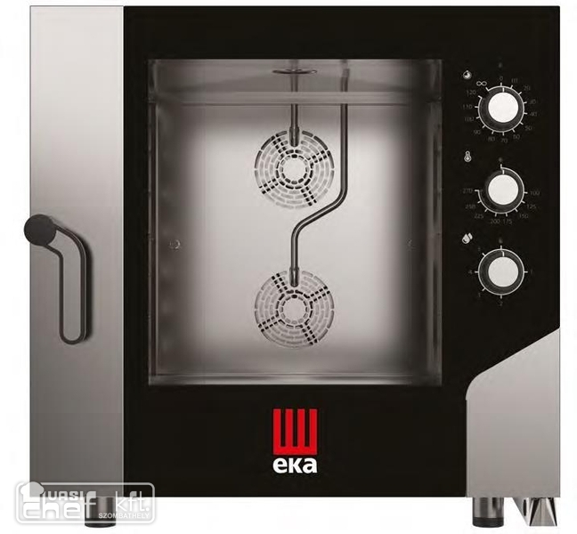 Elektromos légkeveréses sütő 6x 60x40cm tálcahellyel, tekerőgombos vezérléssel, párásítás funkcióval. Síntávolság 80mm. Állítható sütési idő (0-120 perc vagy folyamatos sütési mód). Állítható sütési hőmérséklet: 30-270°C. Állítható páraszint 5 fokozatban. 2db kétírányú ventilátorral. Egyenletes hő- és páratartalom eloszlás a sütőtérben. Rozsdamentes acél kivitel, hővisszaverő üveges jobbra nyíló ajtóval. Leereszthető kondenzvízgyűjtő edény. A berendezéshez tepsi, rács, állvány, vízlágyító, és egyéb kiegészítők külön rendelendők! Lágyított víz használata kötelező! Felér ellenében rendelhető balra nyíló ajtóval!