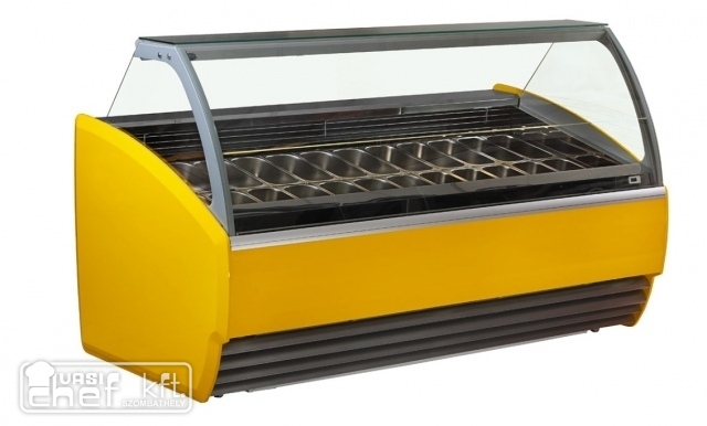 12 tégelyes fagylaltpult porszórt acél külsővel, MDF borítással, ezüst profillal, rozsdamentes munkalappal, kerekekkel és éjszakai takaróval. Ventilációs hűtésű pult, automata leolvasztással. Frontüveg és oldalüveg melegítővel és fehér színű világítással rendelkezik. Hőmérséklet szabályzás -12/-22 fok.