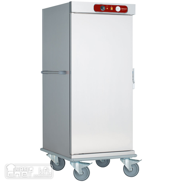 60 mm-es síntávolsággal, belső ventilációval, párásítási lehetőséggel, 0/+90°C közti mechanikus hőmérsékletszabályzással és anaglóg hőmérsékletkijelzéssel, duplafalú hőszigeteléssel, 100°-ig nyíló kulccsal zárható automatikusan visszacsukódó ajtóval, cserélhető ajtótömítéssel, oldalsó fogantyúkkal, alul körben a sarkokon megerősített ütközővel, rozsdamentes acél kivitelben, 4 db 160 mm átmérőjű kerékkel - melyből 2 db fékezhető, rácsok és tálcák nélkül szállítva