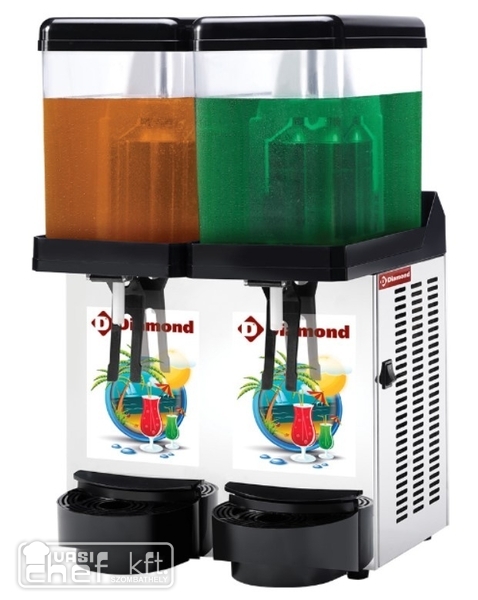 Hűtött italadagoló, 2x12 literes műanyag fedeles átlátszó polikarbonát tartállyal, tartályonként 1 adagolócsappal, környezetbarát R290 hűtőközeggel, led világítással és cserélhető képes reklámpanellel, +2/+8°C között szabályozható hőmérséklettel, rozsdamentes acél hűtőegység burkolattal
