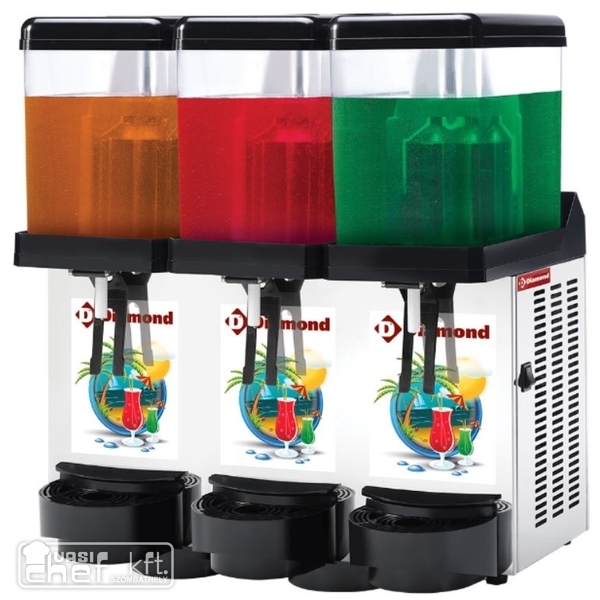 Hűtött italadagoló, 3x12 literes műanyag fedeles átlátszó polikarbonát tartállyal, tartályonként 1 adagolócsappal, környezetbarát R290 hűtőközeggel, led világítással és cserélhető képes reklámpanellel, +2/+8°C között szabályozható hőmérséklettel, rozsdamentes acél hűtőegység burkolattal
