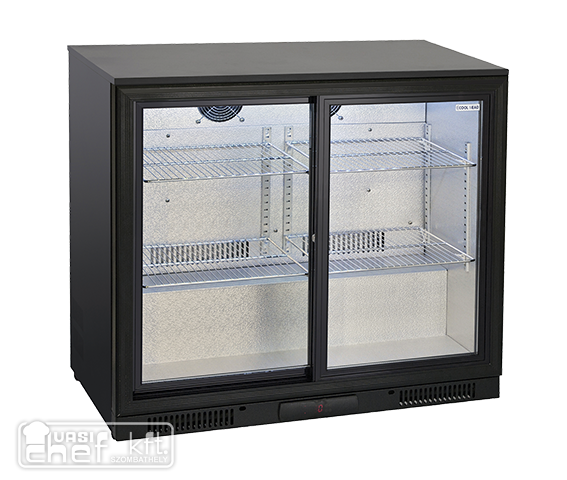 Belső oldala alumínium, kívül fekete bevonatú acél kivitelben, 2 üveg tolóajtóval, 4 állítható krómpolccal, önzáró ajtóval, zárral, belső vízszintes LED-del van felszerelve. könnyű digitális termosztát és edzett biztonsági edzett üveg. Automata leolvasztás. 4 darab állítható láb. Hőmérséklet szabályzás +1/+10 fok. Környezeti hőmérséklet +25 fok. Hűtőközeg R600a.