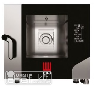Elektromos kombisütő 5xGN1/1 tálcahellyel, érintővezérlős "BLACK MASK" kezelőpanellel. Sínek közti távolság: 68mm. Direkt vízbecskendezéssel. Szabályozható sütőtéri hőmérséklet: 30-270°C. Állítható páraszint 10 fokozatban. Állítható ventiláció (normál, 1/2 sebesség, fél-statikus üzemmód). 1db kétirányú ventilátorral. Programozható kombisütő, 100 programozható recepttel, mindegyikhez 10 főzési ciklus társítható. Programozható előmelegítés és időzitett indítás funkció. Fekete-fehér érintővezérlős kezelőpanel (7") könnyen érthető vezérlő szimbólumokkal és numerikus kijelzéssel. USB port. Rozsdamentes acél kivitel, hővisszaverő üveges jobbra nyíló ajtóval.