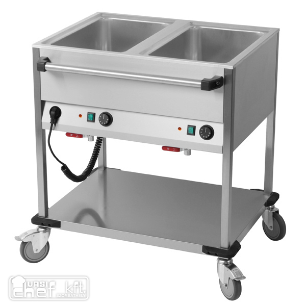 Teljesen rozsdamentes acél kivitel. Vízleeresztő csap. Alsó polccal. 4 darab guruló kerékkel. Hőmérséklet szabályzás +30/+90 fok.