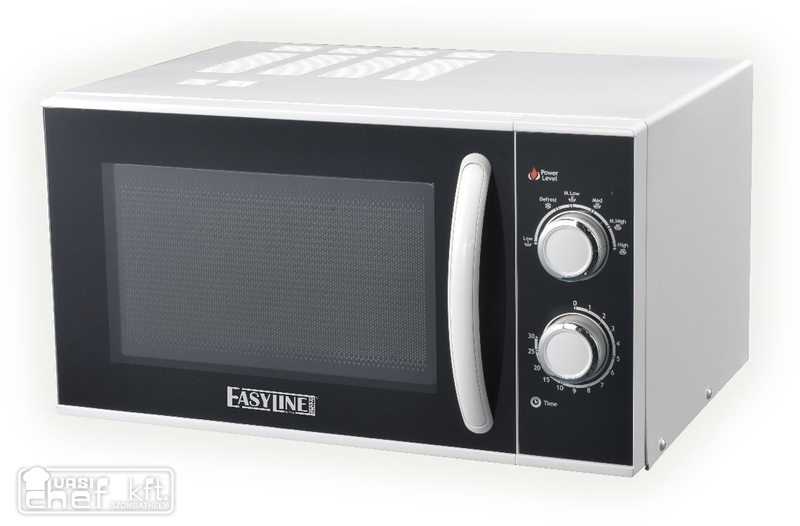 Mikrohullámú sütő mechanikus vezérléssel és forgótányérrel. Fehérre festett, üvegajtóval, 6 teljesítményfokozat, leolvasztó funkció.
