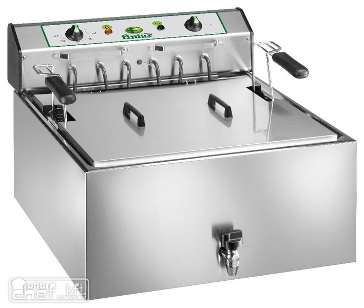 Űrtartalom: 25 liter, rozsdamentes acél kivitel, 1 kosárral, kosárméret: 48X45X12 cm, kapacitás 45 kg/h, hőmérséklettartomány: 50-180°C, teljesen rozsdamentes acél kivitel, nyitott alépítménnyel, olajleeresztő csappal, biztonsági termosztát