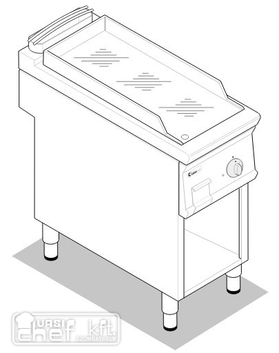 Teljesen rozsdamentes acél kivitel. Állítható lábak. Zsírgyűjtő fiók. 3 oldalt fröccsenés elleni felhajtás. Hőmérséklet szabályzás 60-300 fok között. Alsó nyitott tárolóval, alsó polccal.