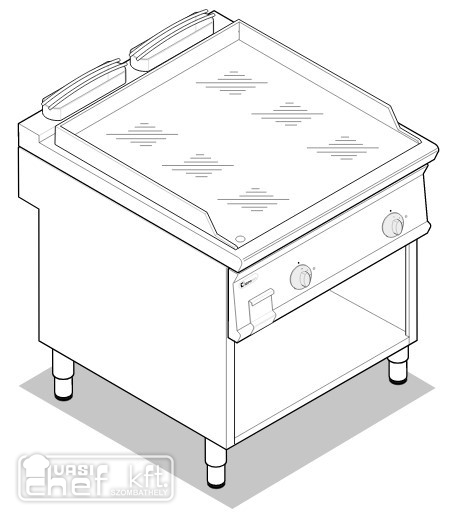 Teljesen rozsdamentes acél kivitel. Állítható lábak. Zsírgyűjtő fiók. 3 oldalt fröccsenés elleni felhajtás. Hőmérséklet szabályzás 100-300 fok között. Alsó nyitott tárolóval, alsó polccal.