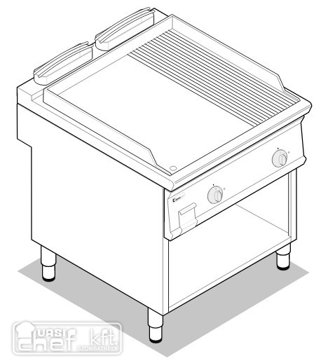 Teljesen rozsdamentes acél kivitel. Állítható lábak. Zsírgyűjtő fiók. 3 oldalt fröccsenés elleni felhajtás. Hőmérséklet szabályzás 60-300 fok között. Alsó nyitott tárolóval, alsó polccal.