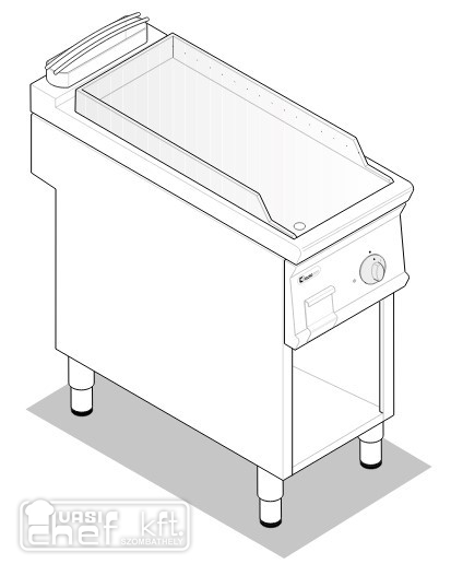 Teljesen rozsdamentes acél kivitel. Állítható lábak. Zsírgyűjtő fiók. 3 oldalt fröccsenés elleni felhajtás. Hőmérséklet szabályzás 60-300 fok között. Alsó nyitott tárolóval, alsó polccal.