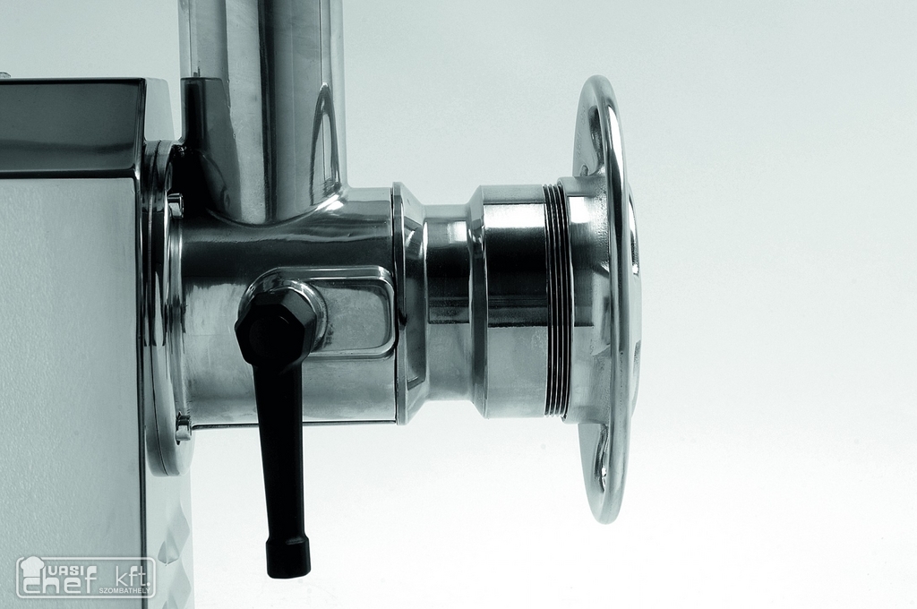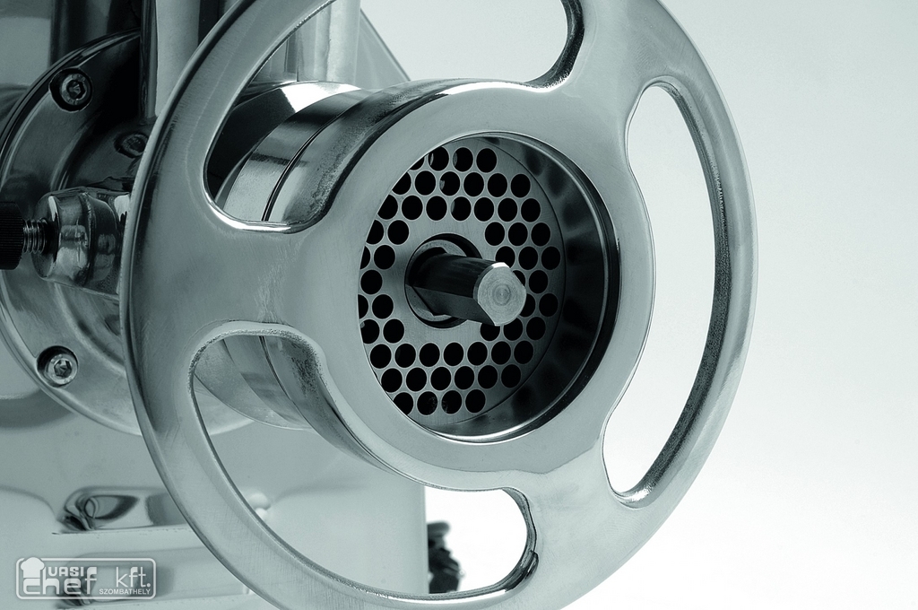 Húsdaráló rozsdamentes házban 22-as méretű, biztonsági kapcsolóval,rozsdamentes késsekel, elővágótárcsával és tárcsával, rozsdamentes etetőtálcával és gyűjtőtálcával.