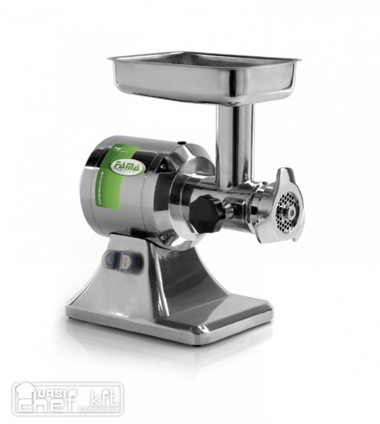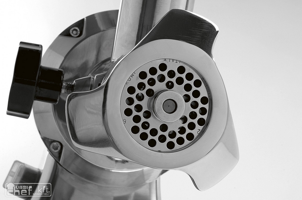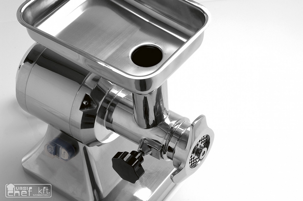 Húsdaráló alumínium öntvény házban 12-as méretű, biztonsági kapcsolóval,rozsdamentes késsel és tárcsával, rozsdamentes etetőtálcával és gyűjtőtálcával.