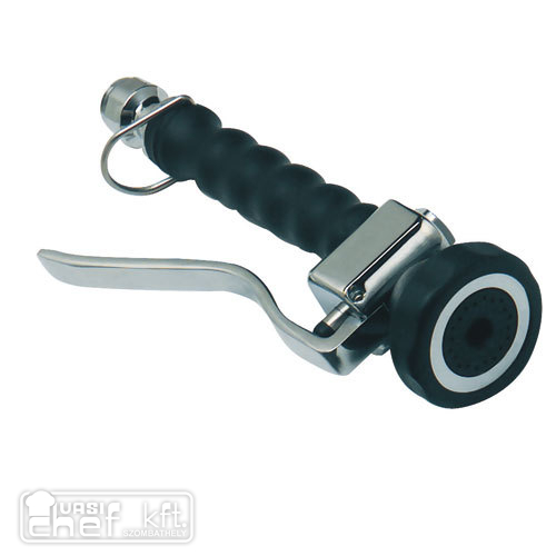 Nagy markolatú, kiakasztható zuhanyfej, a nyitó kar állandó áteresztésre kirögzíthető, származási hely: Olaszország.